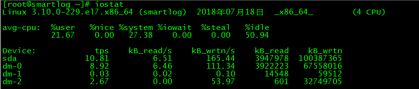 iostat,结果为从系统开机到当前执行时刻的统计信息。