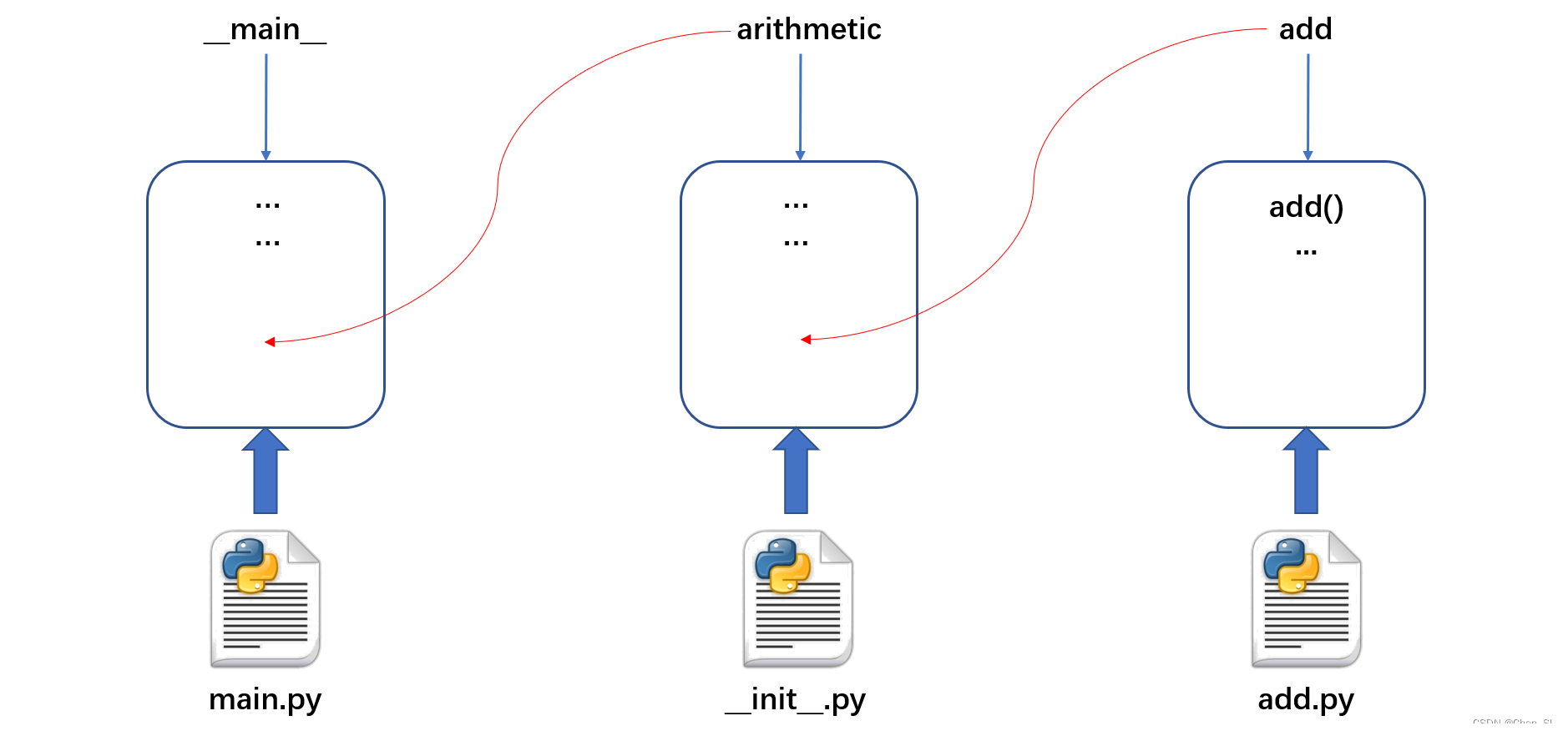 - 首先运行arithmetic包中的 __init__.py 文件(如果存在的话),该模块用到的所有对象都收录到一块新开辟的内存空间中。创建一个变量指向这个内存空间,用来引用其内容。变量的名字就是包名——arithmetic,从这个意义上说包其实也相当于一个模块。将arithmetic添加到sys.modules中。将arithmetic添加到main模块的局部命名空间中。