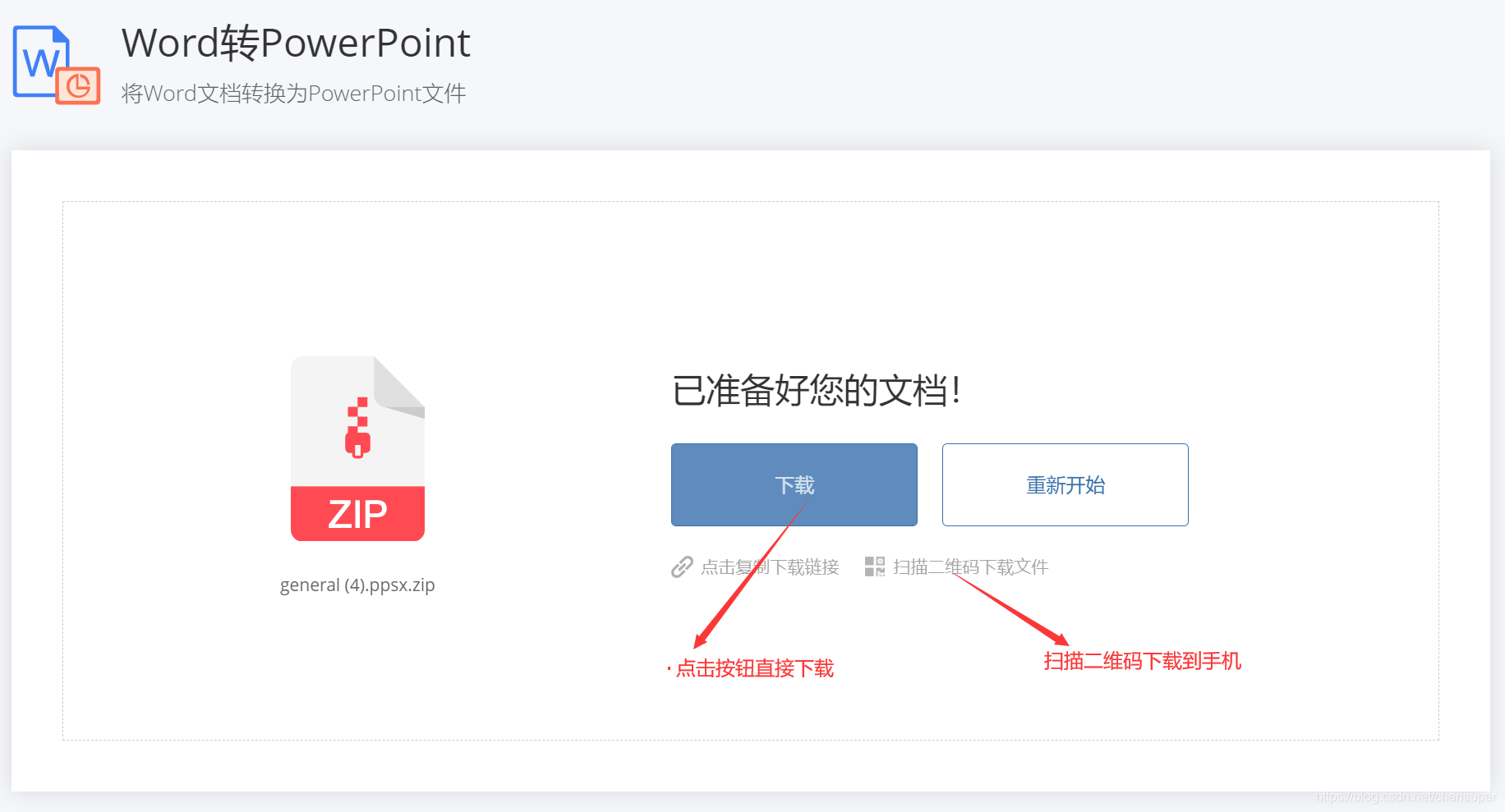 6. 转换完成后,你可以点击下载按钮进行下载,也可以选择扫描二维码下载到手机