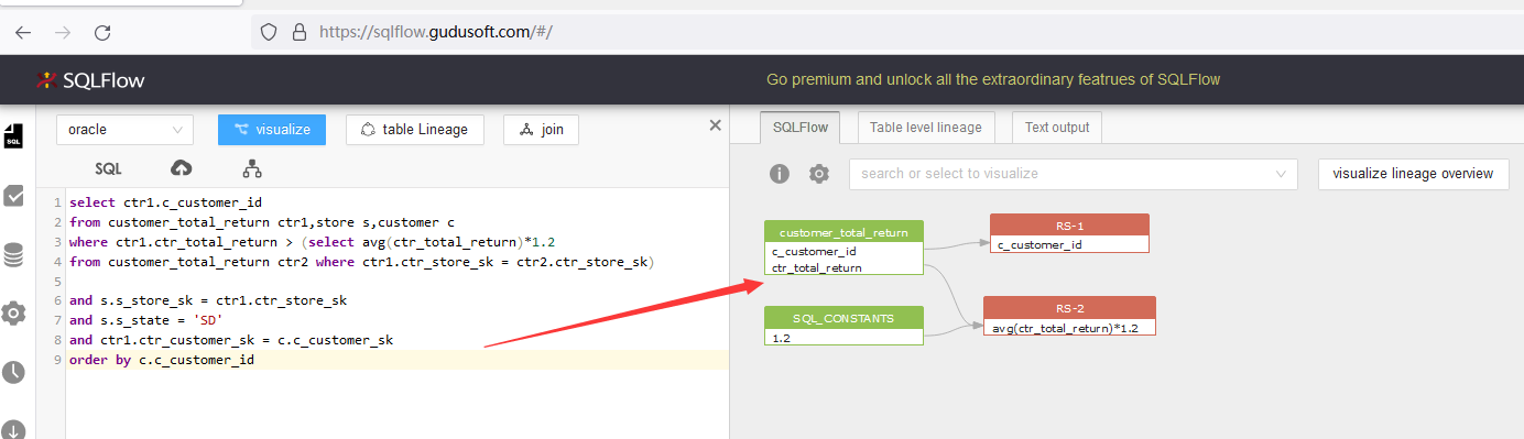 上述语句是一个3表(customer_total_return ,store,customer)关联的简单语句,它的运算结果是返回复合条件的c_customer_id列集合。不难看出,关联条件(and s_store_sk = ctr1.ctr_store_sk and s_state = 'SD' and ctr1.ctr_customer_sk = c_customer_sk)中s_store_sk 、s_state 、c_customer_sk等三个列并没有指定来源。该语句之所以在Oracle查询分析器中没有错误,是因为查询分析器可以拿到三个表定义进行遍历对比,如果上述未指定来源表的列恰好都只属于某个表,此时查询分析器便能正常解析并执行该语句。