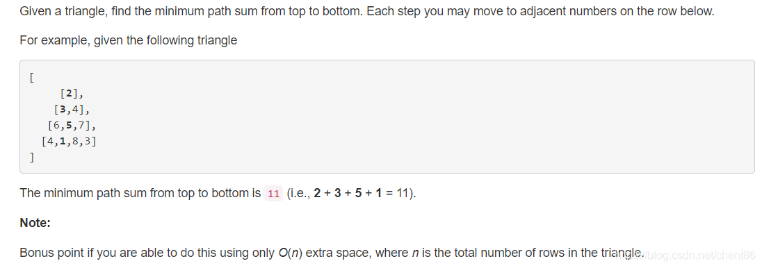 dp[i,j] = min(dp[i-1] [j-1], dp[i-1][j]) + triangle[i][j];