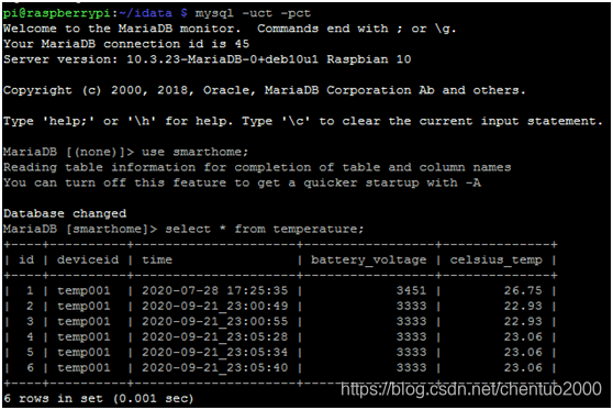 # 登录本地MariaDB(MySQL)数据库,并将值写入表temperature