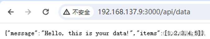 现在服务器正在运行,并且有一个端点 /api/data 可以返回 JSON 数据。你可以在浏览器中使用 Fetch API 来调用这个端点。