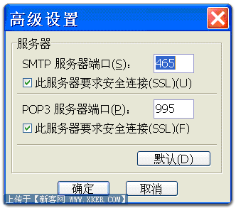 - 选中"接收邮件 (POP3)"下"此服务器要求安全连接 (SSL)"旁边的复选框。此端口将更改为 995。单击"确定"。