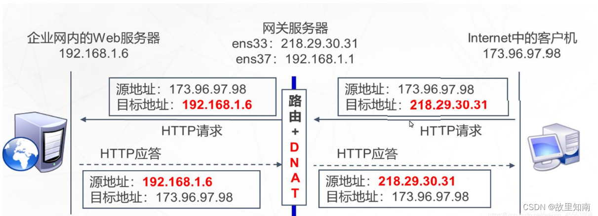 注意∶ 使用DNAT时,同时还有配合SNAT使用,才能实现响应数据包的正确返回 小知识扩展∶