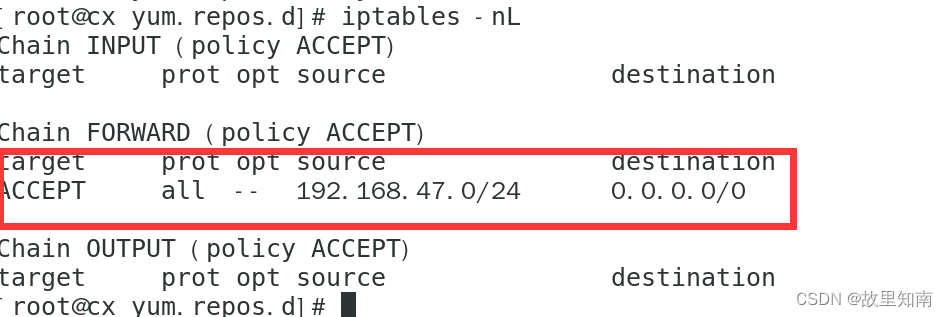 [root@cx yum.repos.d]# iptables -t filter -A FORWARD -s 192.168.47.0/24 -j ACCEPT