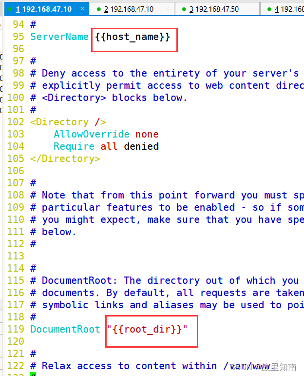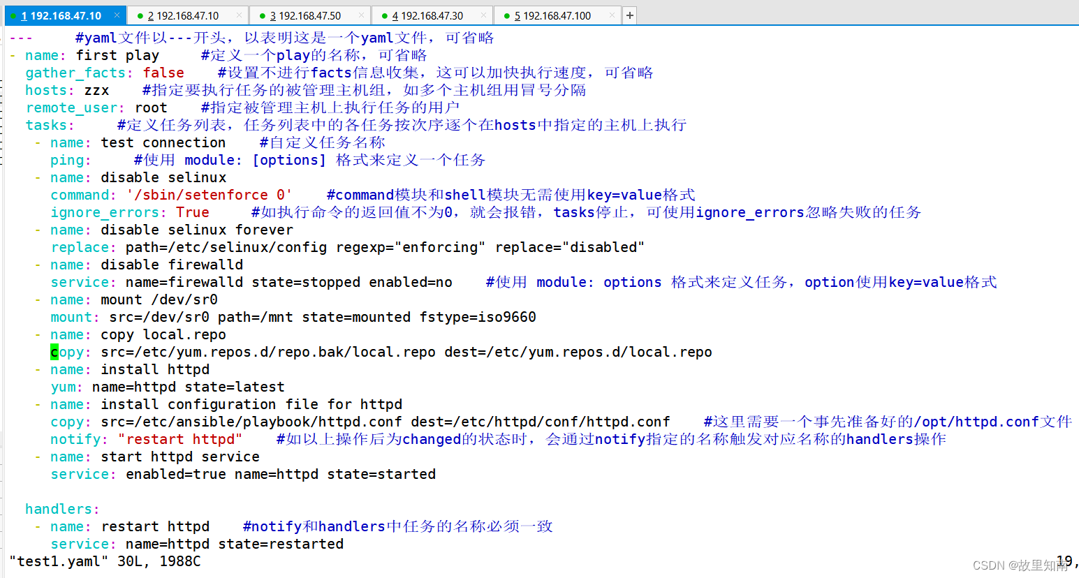 copy: src=/etc/ansible/playbook/httpd.conf dest=/etc/httpd/conf/httpd.conf #这里需要一个事先准备好的/opt/httpd.conf文件