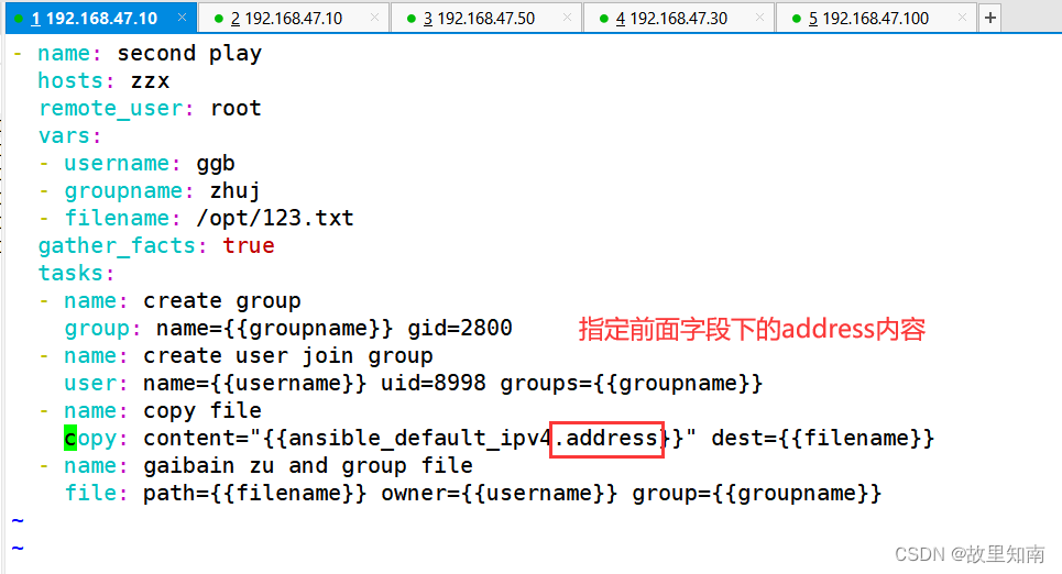 when: ansible_default_ipv4.address == "192.168.80.12" #when指令中的变量名不需要手动加上 {{}}