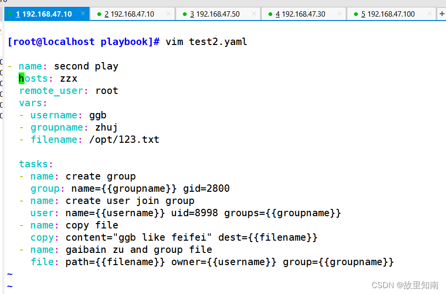 hosts: zzx #指定要执行任务的被管理主机组,如多个主机组用冒号分隔