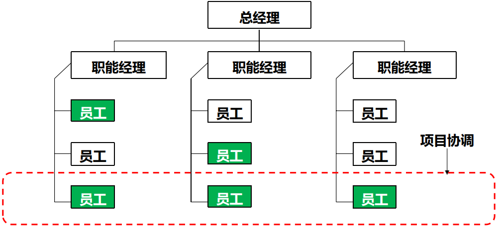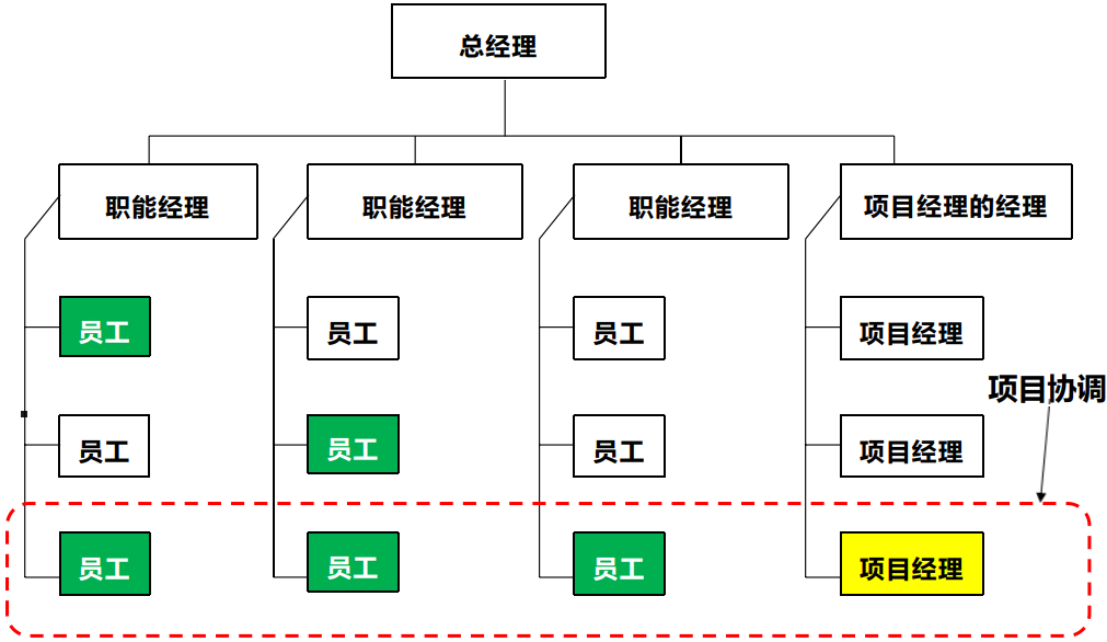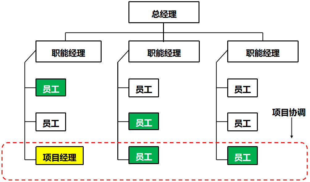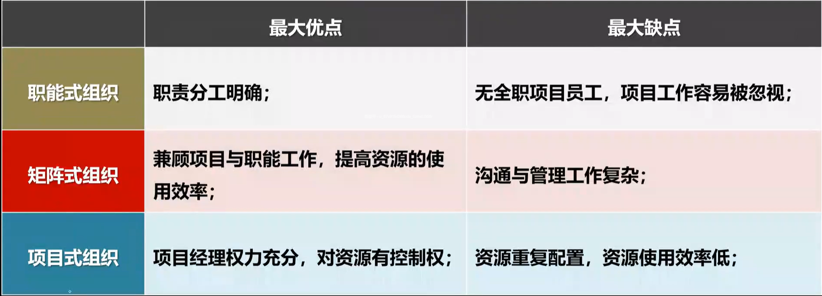 - 缺点:项目型组织缺乏稳定性,员工缺乏事业的连续性和保障。 资源配置重复,使用效率低。