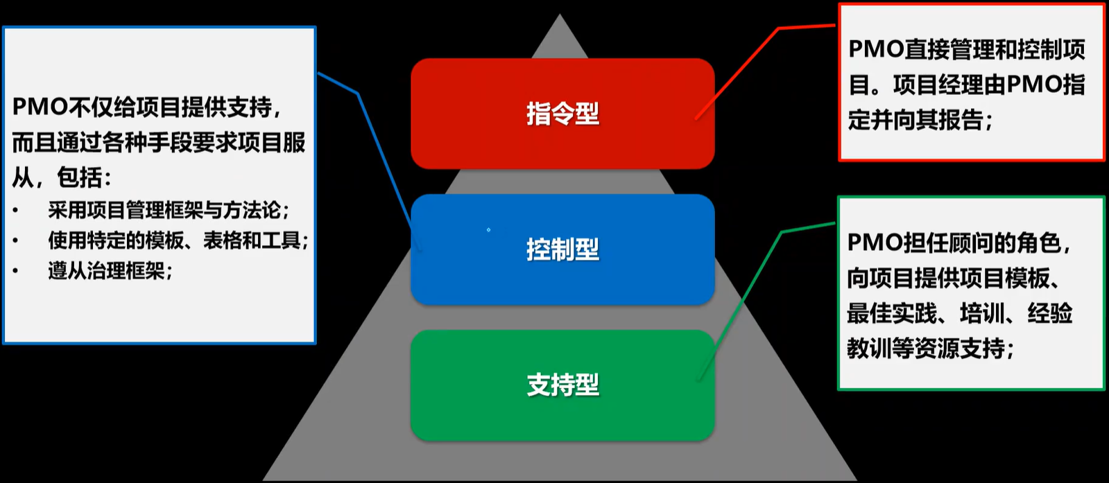 - PMO 的职责范围可大可小,从提供项目管理支持服务,到直接管理一个或多个项目