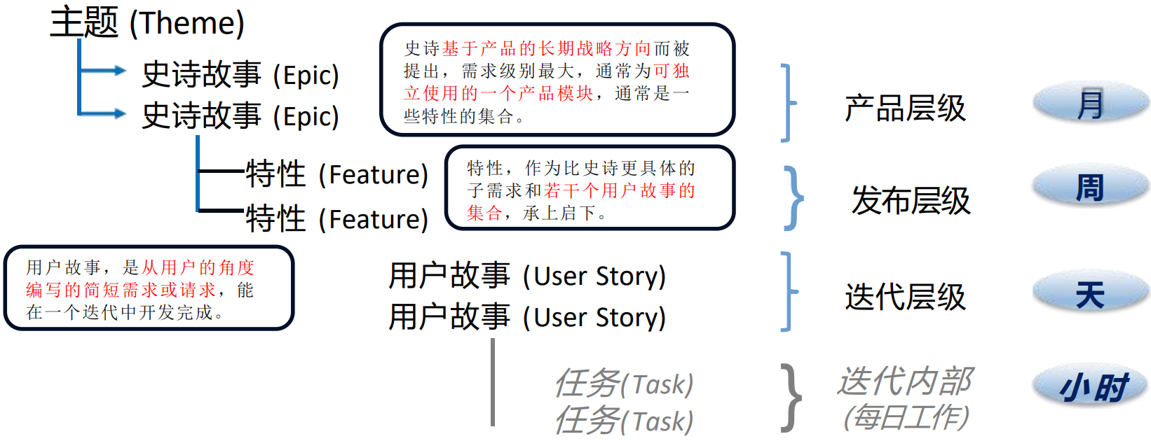 - PS. 每项需求可能并不需要完成上述全部规模所定义的内容。例如,在完成其它高优先级需求的开发之前,或许你不需要花时间去分解低优先级的需求;反之,你可以在创建一个具体的用户故事, 而不需要考虑史诗级别的定义