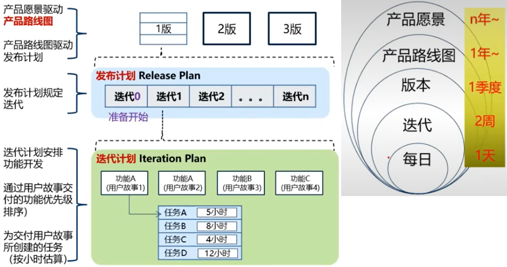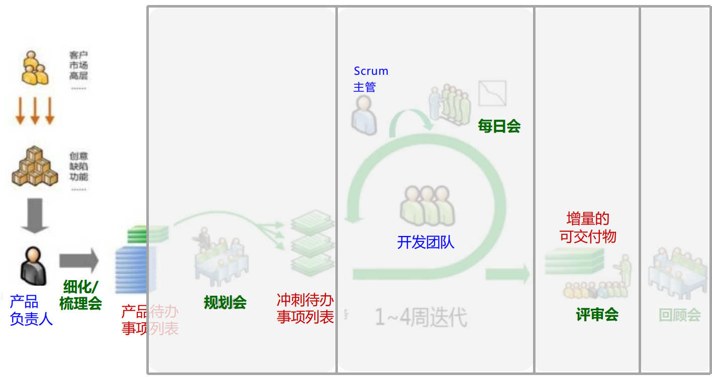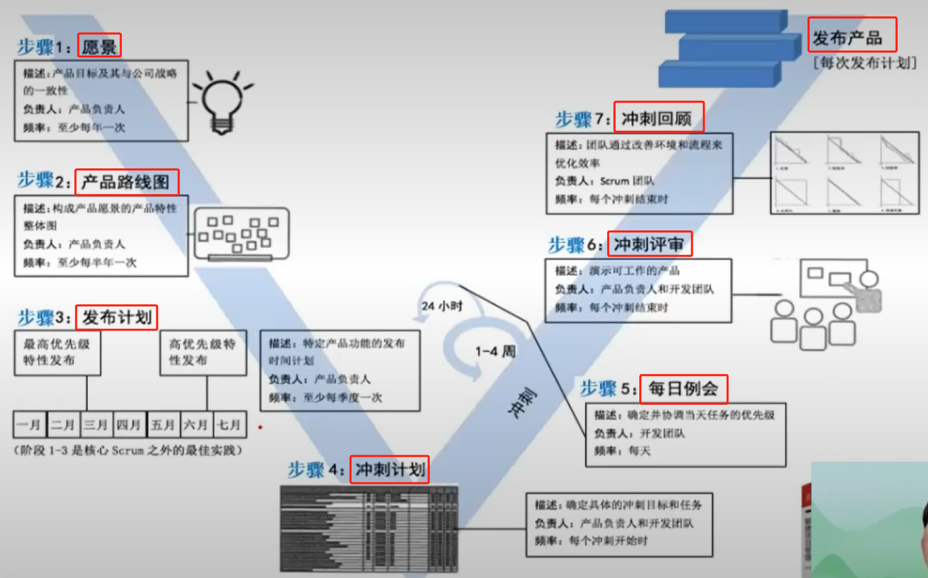 愿景->产品路线图->发布计划->冲刺计划->每日例会->冲刺评审->冲刺回顾->发布产品