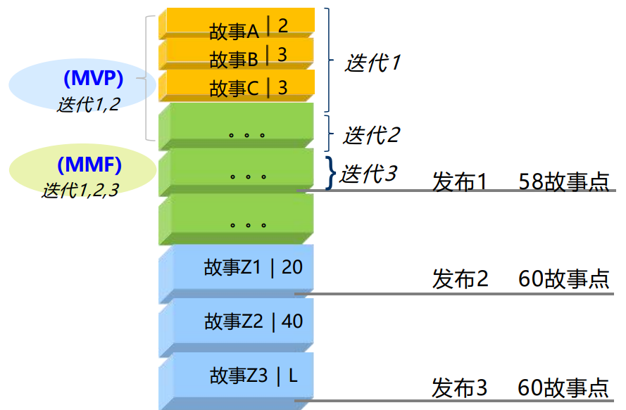 - MMF最少可售特性 (Minimal Marketable Feature):已经确认是有价值的产品特性,可以开发出来进行销售