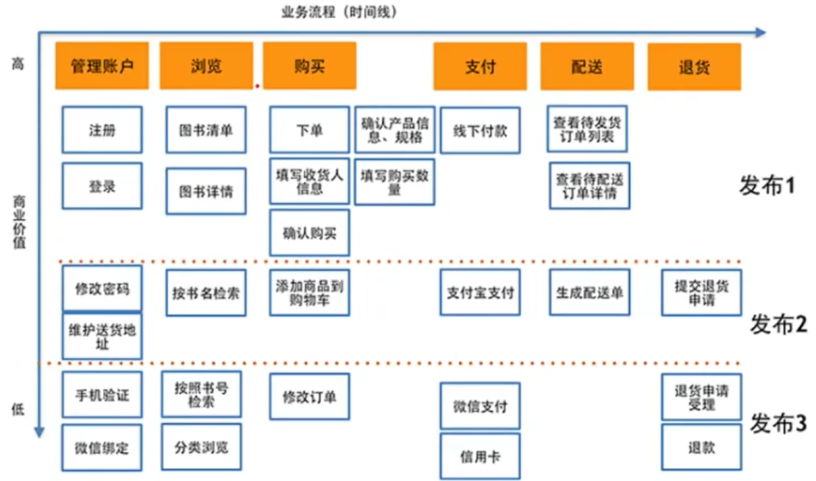 - 故事地图是对当前已经较为明确的用户故事集合进行梳理,以便团队对产品的所有需求有一个整体的视角,做到即看见树木又能看到森林两个地图可以组合使用,相得益彰: