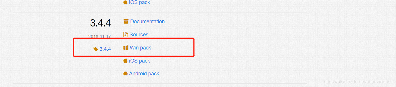 点击“win pack”下载win安装文件opencv-3.4.4-vc14_vc15.exe。