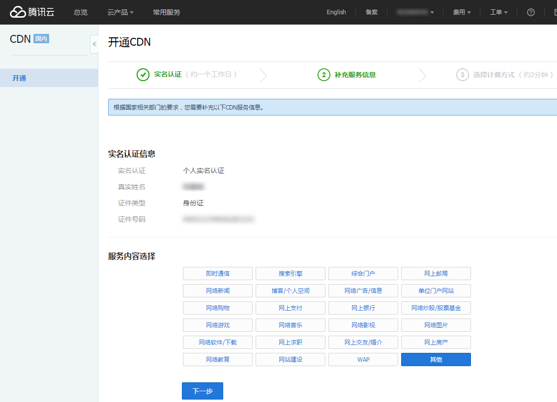 完成实名认证后,进入 CDN 控制台,确认您的实名认证信息及选择服务内容,完成后单击【下一步】。