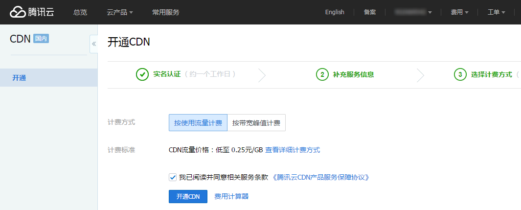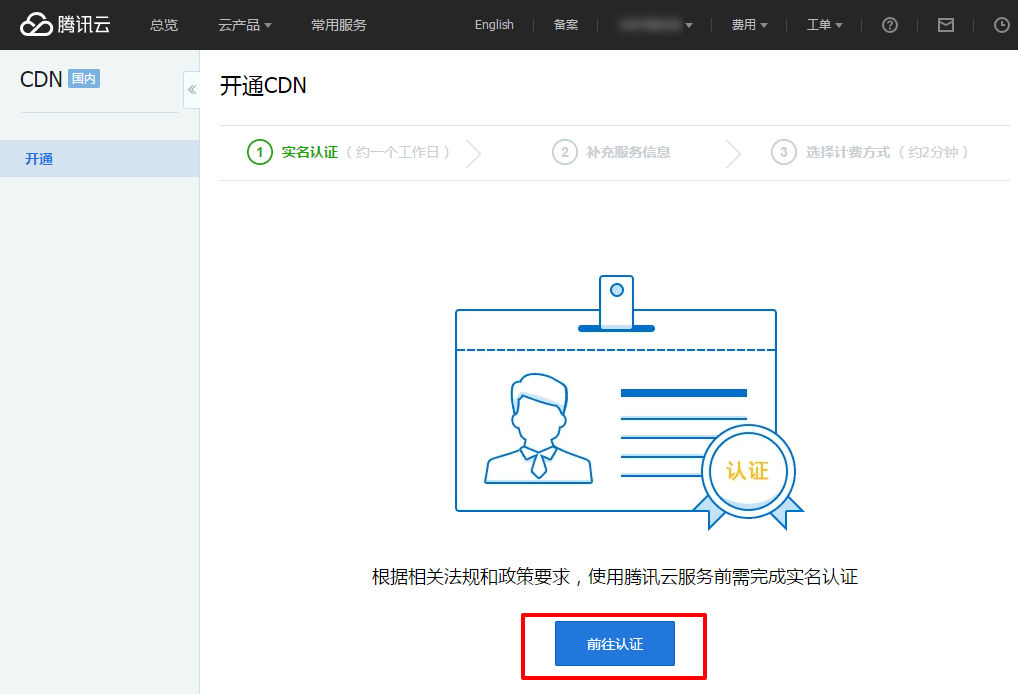 在使用 CDN 服务前,您需要进行实名认证及 CDN 服务的开通,如果您的腾讯云账号已经开通 CDN,请直接跳到第二步。