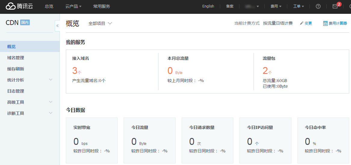 确认付费方式,单击【开通 CDN 】即可开通 CDN 服务并跳转到 CDN 概览页,您可以通过概览页了解您的 CDN 整体情况。