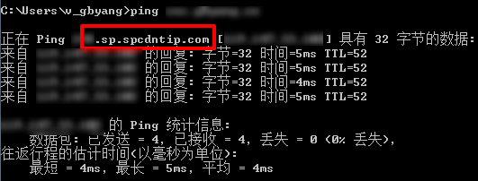 3.验证 CNAME 是否生效:不同的DNS服务商,CNAME 生效的时间略有不同,一般会在半个小时之内生效。您也可以通过 PING 的方式来查询 CNAME 是否生效,如果 PING 到后缀为 .sp.spcdntip.com 的域名,表示域名 CNAME 已生效。
