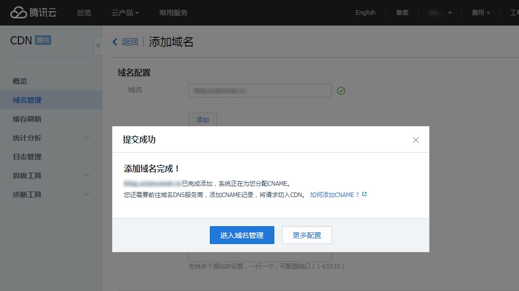 3.提交域名,添加完成,请耐心等待域名配置下发至全网节点,下发时间约 15 分钟。