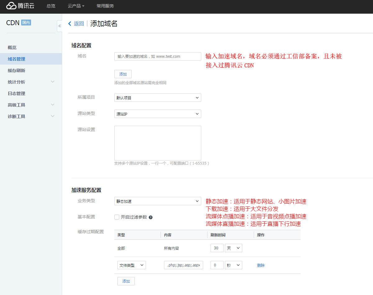 在域名位置填入需要加速的域名,该域名需要满足以下条件: