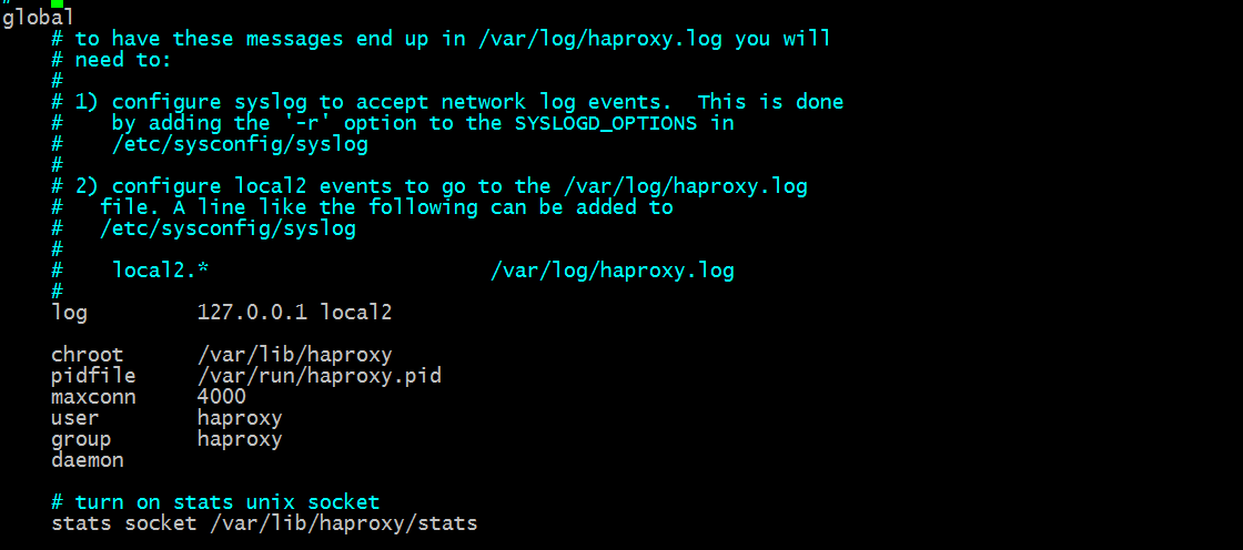 提示:以上是haproxy1.5.18yum安装里默认提供的global配置段;其中log是用来指定日志的,这里要说一下haproxy的日志,它和nginx的日志不太一样;nginx的日志是我们用access_log 指令来指定日志文件和调用日志格式的名称,意思就是把日志以增量的方式往指定的日志文件中写;而haproxy的日志不是自己记录日志,而是通过把日志发送给rsyslog服务器上的一个facility上,然后通过rsyslog的配置把指定facility上的日志记录到某个文件中或者数据中;以上配置段意思就是把haproxy的日志发送给本机的rsyslog上的local2 记录所有级别类型的日志;其实我们不用配置rsyslog,默认会把日志记录到/var/log/messages这个文件中,这是因为rsyslog中明确定义了所有facility上的info级别以及info级别以上的日志都记录到/var/log/messages中;有关rsyslog的配置说明可以参考本人博客https://www.cnblogs.com/qiuhom-1874/p/12091118.html;接下来我们来配置下,让haproxy的日志记录到/var/log/haproxy.log这个文件中去;