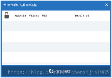 3、分别打开模拟器和手机助手,选择手机助手右上角的"尚未连接手机",将会弹出可连接设备,模拟器设备弹出界面如下: