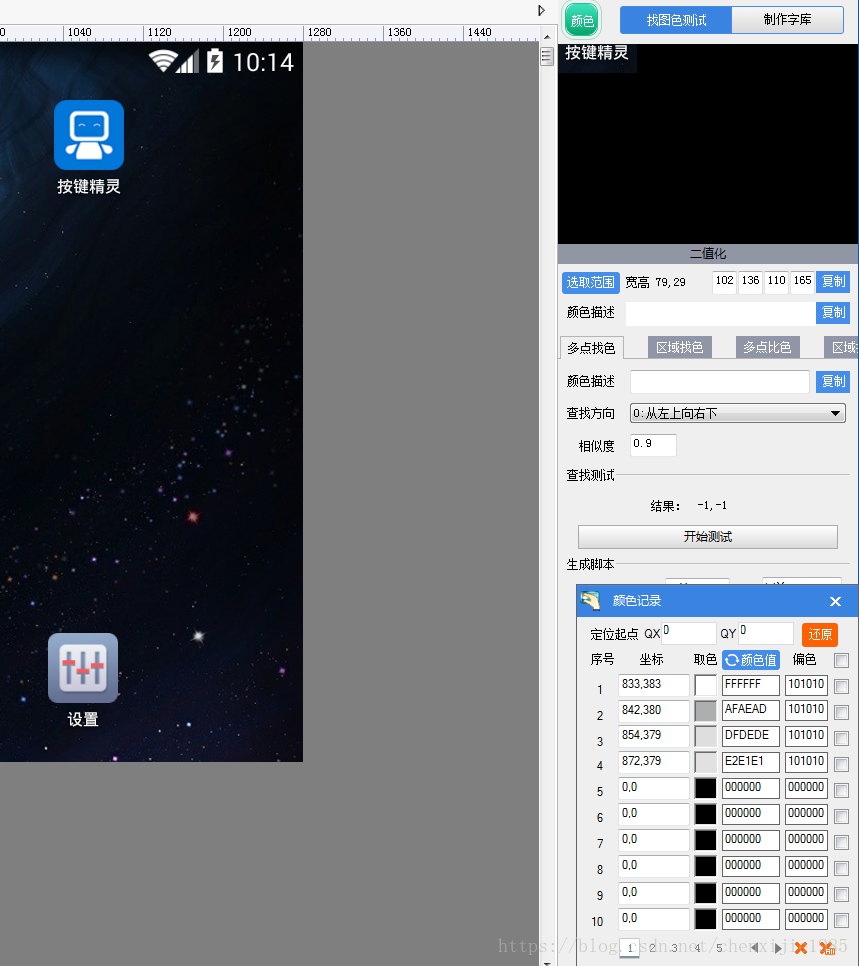 上面的字库脚本主要用作查找“按键精灵”这4个字的脚本,可以修改FindStr前4个参数的为0,0,0,0,表示全屏幕查找。有了字库脚本,就可以不受“按键精灵”这个app位置影响了。