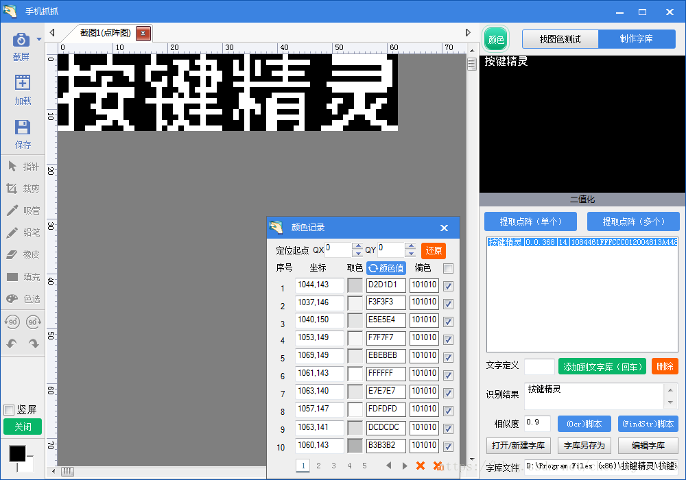 可利用小键盘的方向键来移动鼠标位置,选择10个点颜色点后,点击“提取点阵(单个)”,再选中下方数字串,接着在“文字定义”中输入按键精灵4个字,点击(添加到文字库),下方的识别结果中会出现“按键精灵”4个字,至此,说明字库制作完成。
