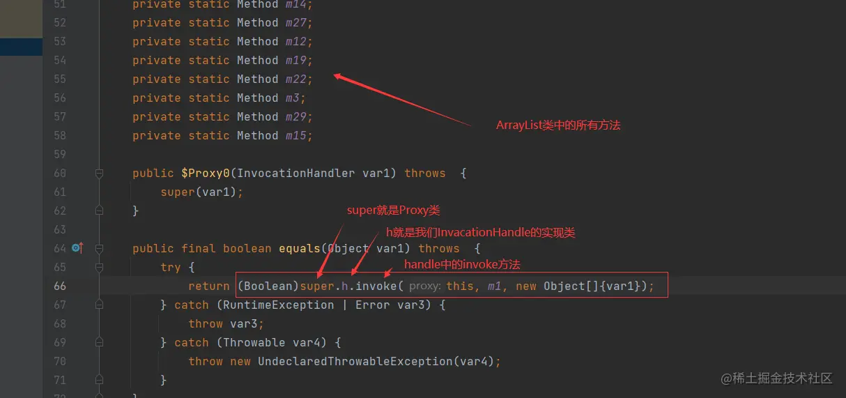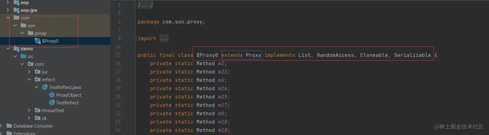 从图中可以看出,代理类对象实现了ArrayList类中实现的所有接口,并且继承了一个Proxy类。