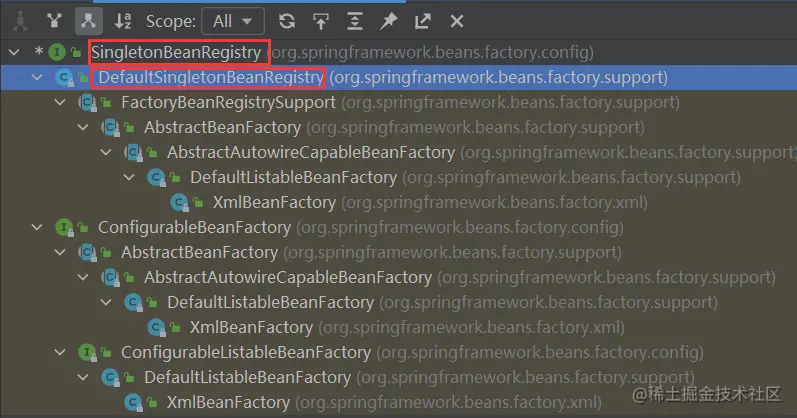 从图中可以看出,有BeanFactory实现了SingletonBeanRegistry,已知SingletonBeanRegistry是存放Bean实例的地方,那BeanFactory实现SingletonBeanRegistry,无非是想创建bean和获取bean。