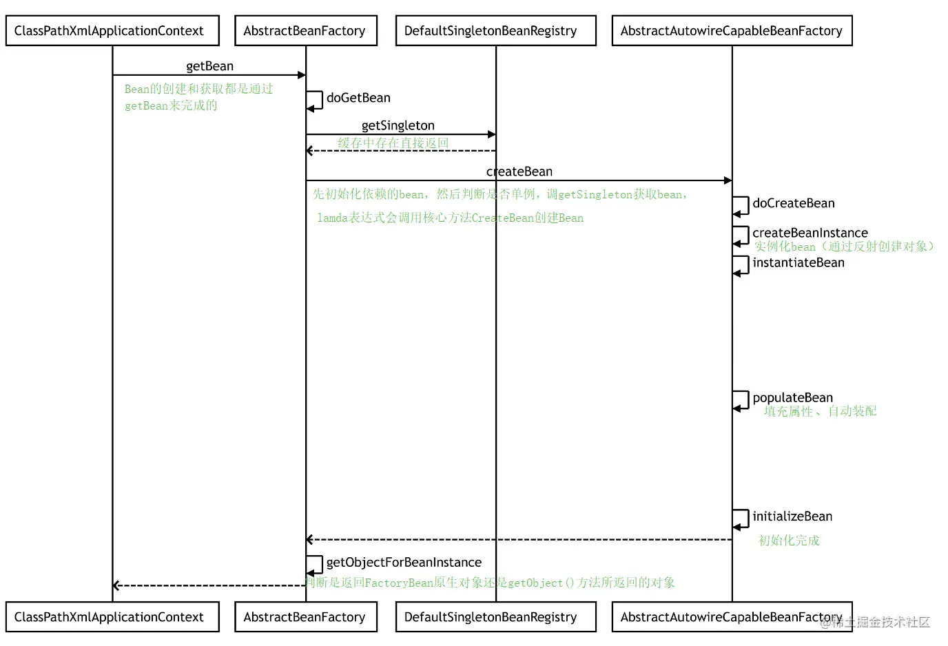- getBean方法在Bean的创建和获取过程中都会用到;另外,我们要注意spring方法起名的特点,有getBean方法,又会有doGetBean方法。同理,后面调用createBean方法,也会调用到doCreateBean方法。