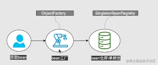 先说一下Bean的创建和管理的一个基本过程, 我们想要获取一个Bean,首先要从我们的bean工厂中获取(注意说的是ObjectFactory),bean工厂则是要去bean仓库中去取,如果仓库中有就直接返回,没有则会创建然后再返回。