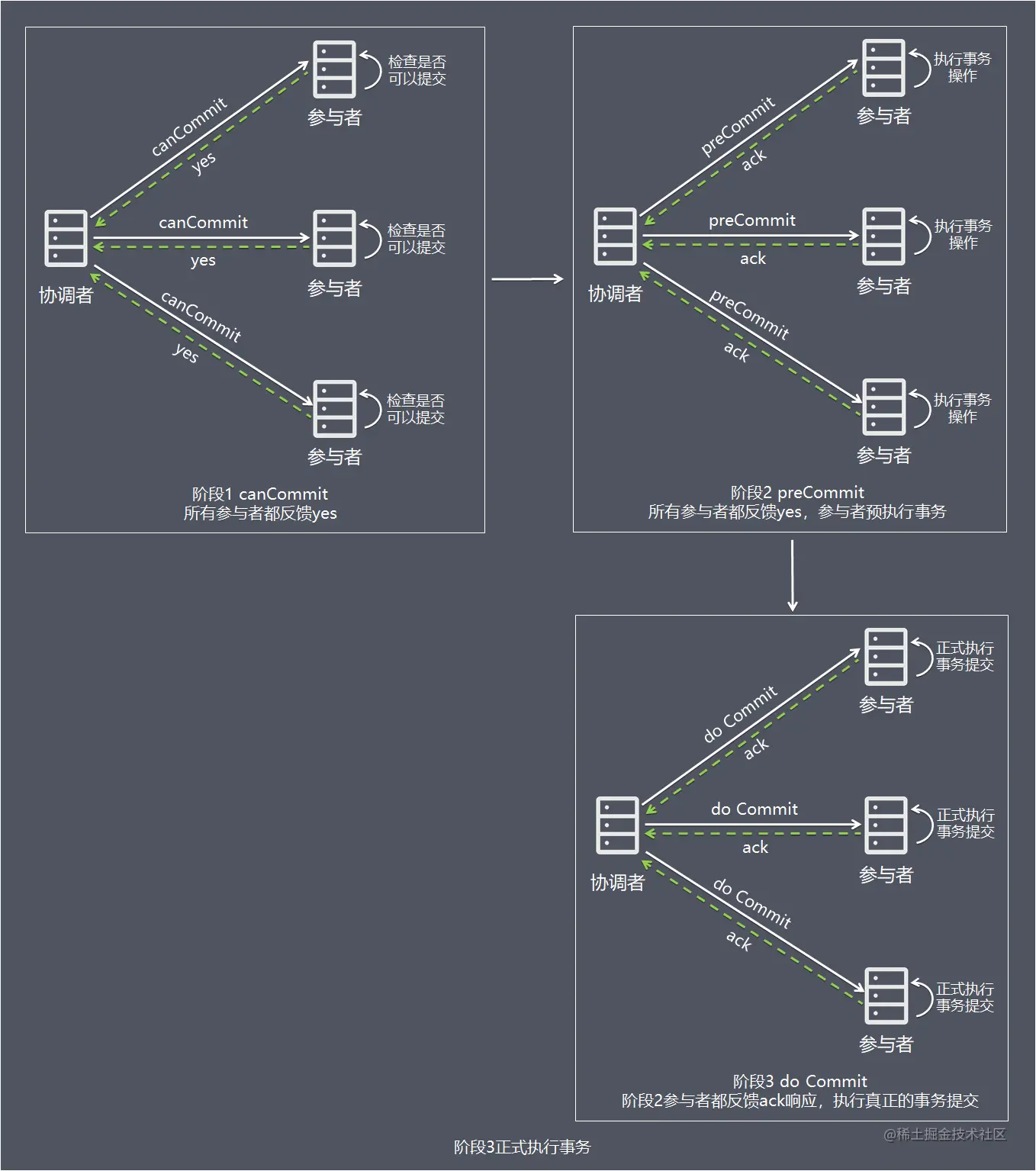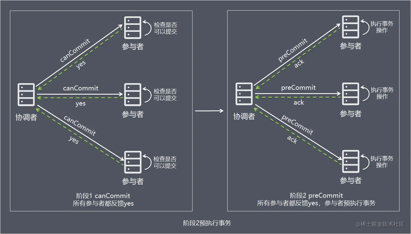 二阶段提交的算法思路可以概括为:参与者将操作成败通知协调者,再由协调者根据所有参与者的反馈情报决定各参与者是否要提交操作还是中止操作。