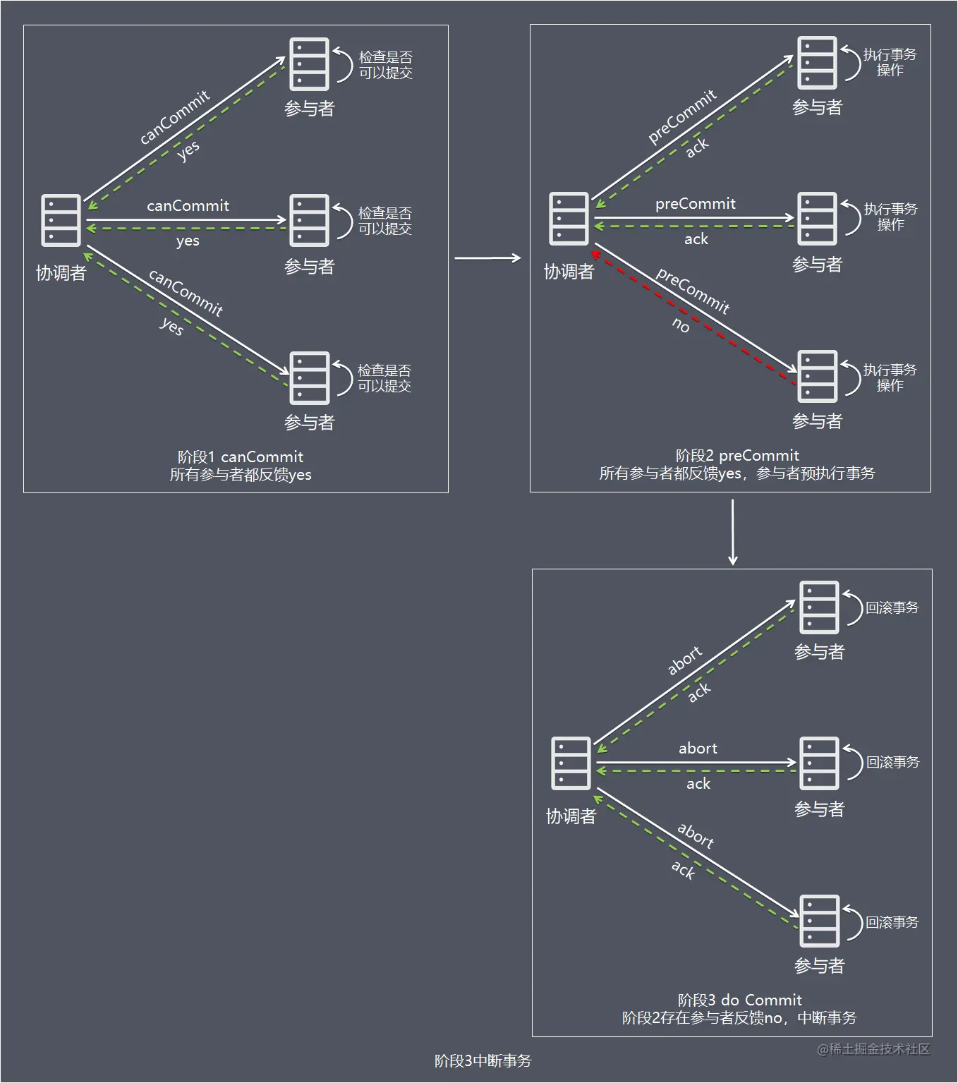 - 2、无论收到协调者发出的abort请求,或者在等待协调者请求过程中出现超时,参与者均会中断事务。