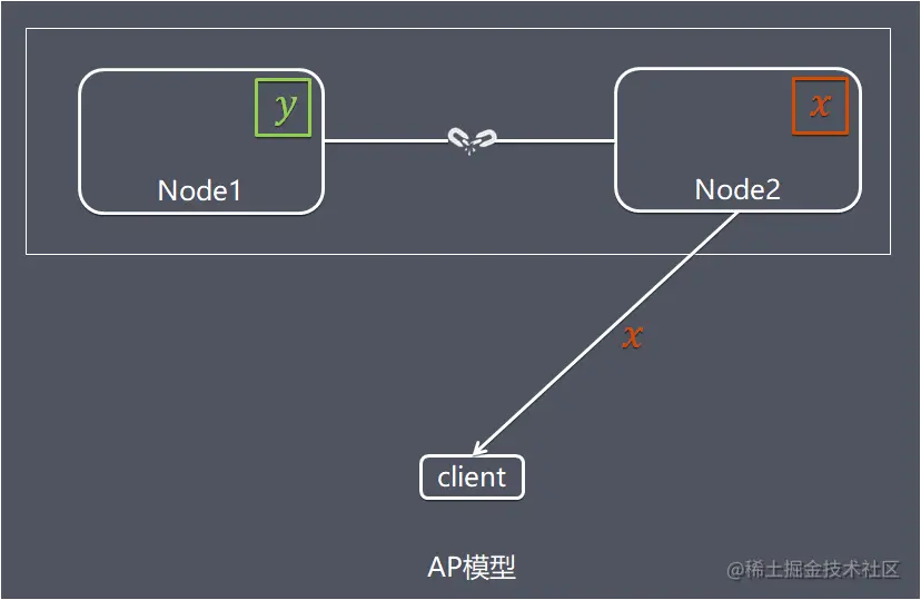 同样是Node2 节点上的数据还是旧数据x,这时客户端C 访问 Node2 时,Node2 将当前自己拥有的数据 x 返回给客户端 了,而实际上当前最新的数据已经是 y 了,这就不满足一致性(Consistency)的要求了,因此 CAP 三者只能满足 AP。