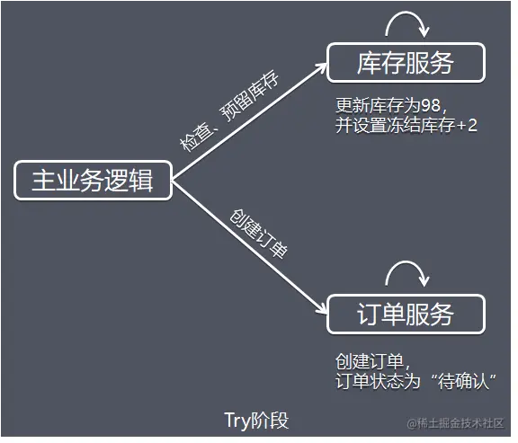 从执行阶段来看,与传统事务机制中业务逻辑相同。但从业务角度来看,却不一样。TCC机制中的Try仅是一个初步操作,它和后续的确认一起才能真正构成一个完整的业务逻辑,这个阶段主要完成: