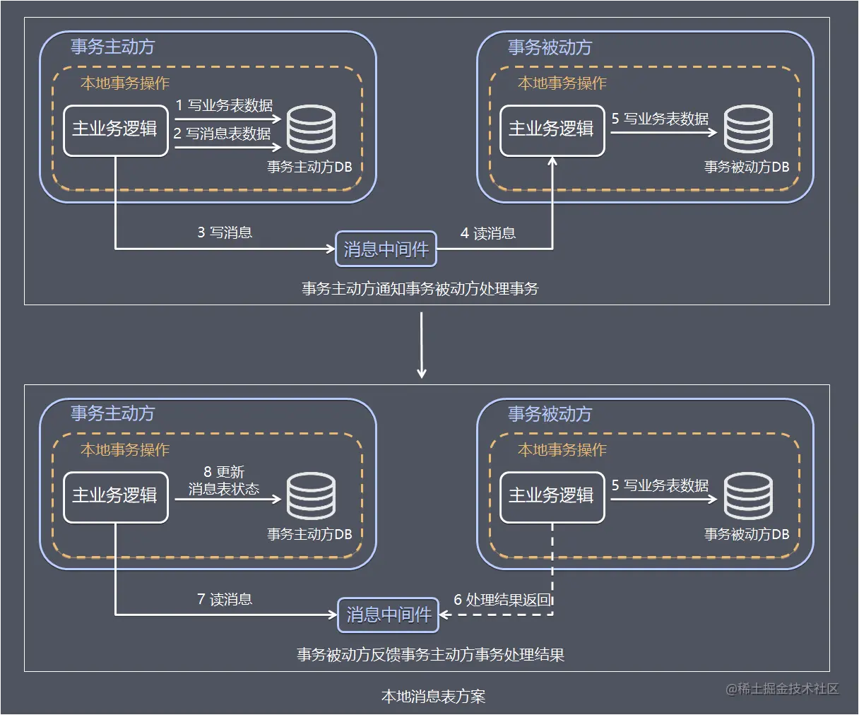 方案通过在事务主动发起方额外新建事务消息表,事务发起方处理业务和记录事务消息在本地事务中完成,轮询事务消息表的数据发送事务消息,事务被动方基于消息中间件消费事务消息表中的事务。