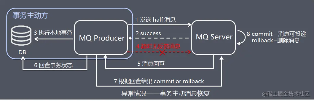 - 6、发送方收到消息回查后,需要检查对应消息的本地事务执行的最终结果。