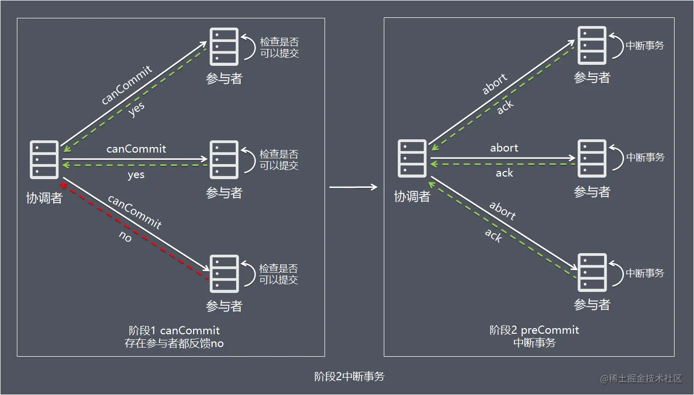 阶段2任何一个参与者反馈no,或者等待超时后协调者尚无法收到所有参与者的反馈,即中断事务: