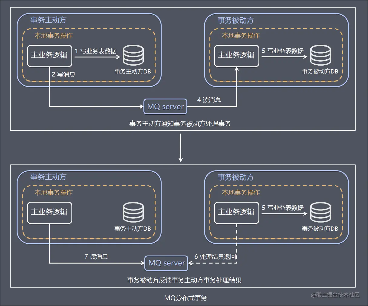 下面把分布式事务最先开始处理的事务方成为事务主动方,在事务主动方之后处理的业务内的其他事务成为事务被动方。