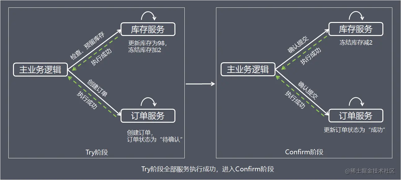 当Try阶段服务全部正常执行, 执行确认业务逻辑操作
