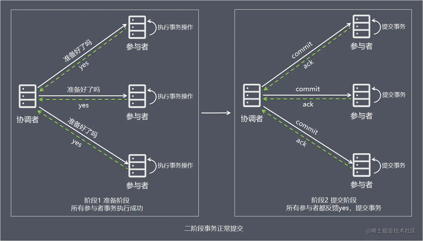 二阶段提交协议(Two-phase Commit,即2PC)是常用的分布式事务解决方案,即将事务的提交过程分为两个阶段来进行处理:准备阶段和提交阶段。事务的发起者称协调者,事务的执行者称参与者。