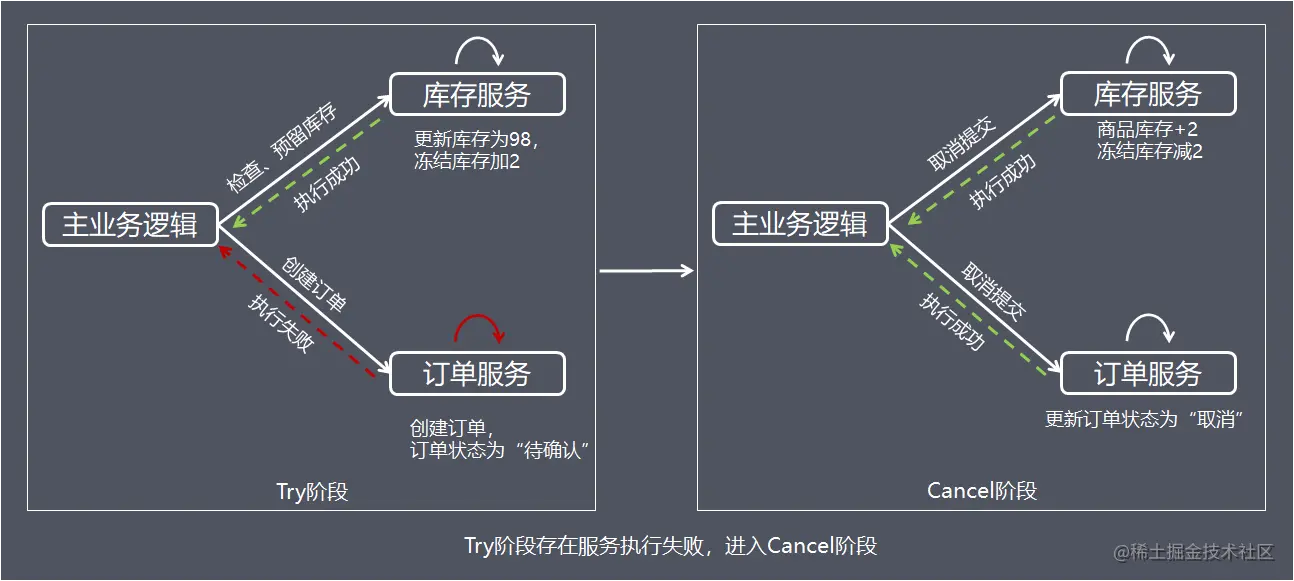 Cancel取消执行,释放Try阶段预留的业务资源,上面的例子中,Cancel操作会把冻结的库存释放,并更新订单状态为取消。