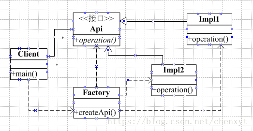 图中前边示例的实现方式是Client通过创建Api的实例Impl1或者Impl2实现operation功能,使用了设计模式之后的实现方式是创建一个工厂类,客户端调用这个工厂类来实现创建Api接口的实例Impl1或者Impl2,从而实现了真正的面向接口编程,隐藏了接口Api的实现部分Impl1或者Impl2