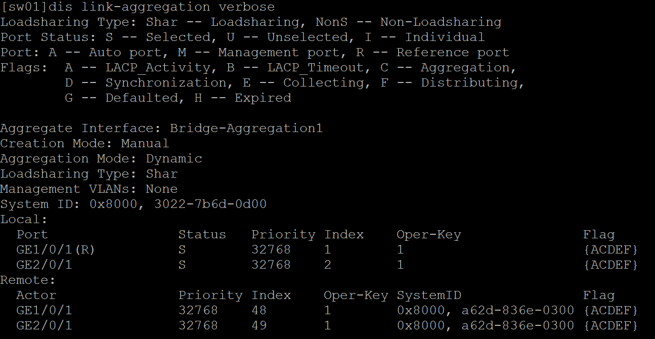 [sw01-Bridge-Aggregation1]link-aggregation mode dynamic