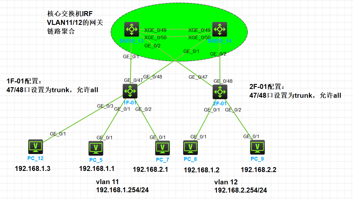 任务内容:配置2台核心交换机及2台接入交换机,核心交换机IRF堆叠,接入交换机划分不同的VLAN,VLAN网关在核心交换机配置。