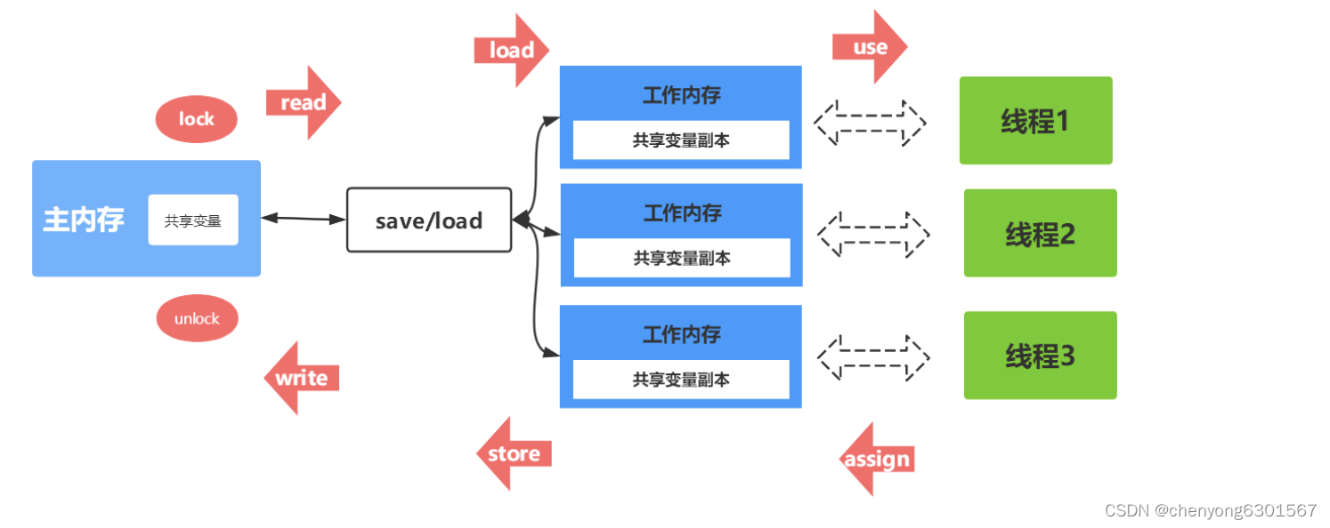 (4)load(载入):作用于工作内存的变量,它把read操作从主内存中得到的变量值放入工作内存的变量副本中
