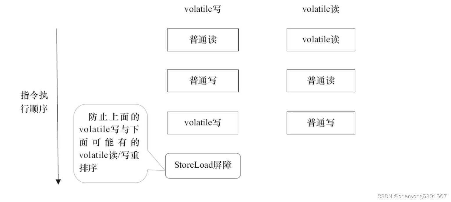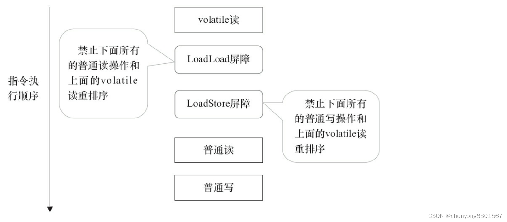上图中LoadLoad屏障用来禁止处理器把上面的volatile读与下面的普通读重排序。LoadStore屏障用来禁止处理器把上面的volatile读与下面的普通写重排序。
